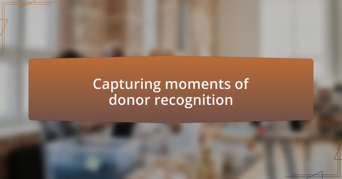 Recognizing donors is about more than just saying thank you; it’s about capturing those authentic moments that celebrate their generosity. I remember a time when we hosted a donor recognition event, and as I watched our supporters interact with the beneficiaries of their contributions, I could see the joy radiating from them. This wasn’t just an evening of speeches; it was an emotional tapestry woven from gratitude, stories, and shared successes. Have you ever experienced that kind of energy in a room filled with giving hearts?