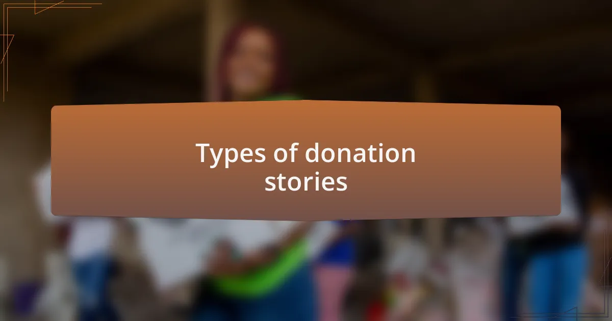 When it comes to donation stories, I find they often fall into a few distinct types. One type is the success story, where you see tangible results from contributions. I recall a project I supported that built a well in an underprivileged community. The pictures of smiling children with clean water were a stark reminder of why I give—these images conveyed hope and transformation. Have you ever felt that rush of gratification when you can actually see the impact of your generosity?
