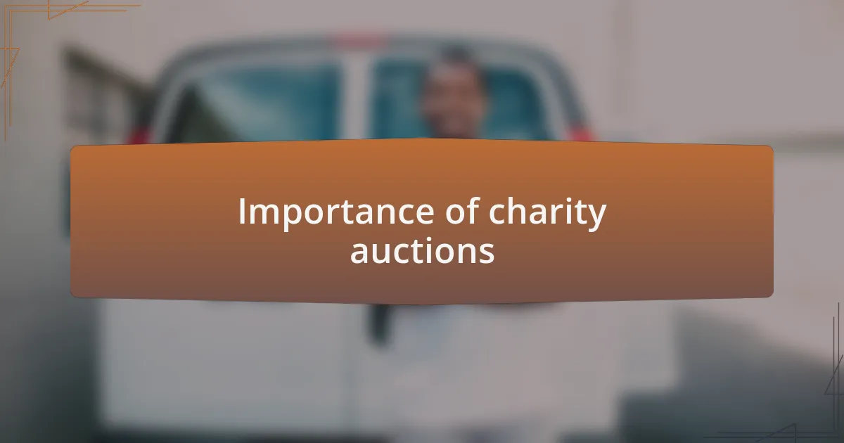 Charity auctions play a crucial role in fundraising, enabling organizations to gather significant financial support while creating a fun and engaging atmosphere. I remember being part of an auction where the energy in the room was electric; bidders were not just competing for items, but also rallying around a shared cause, feeling a connection to the mission. Isn’t it remarkable how the excitement of potential wins can unite people?