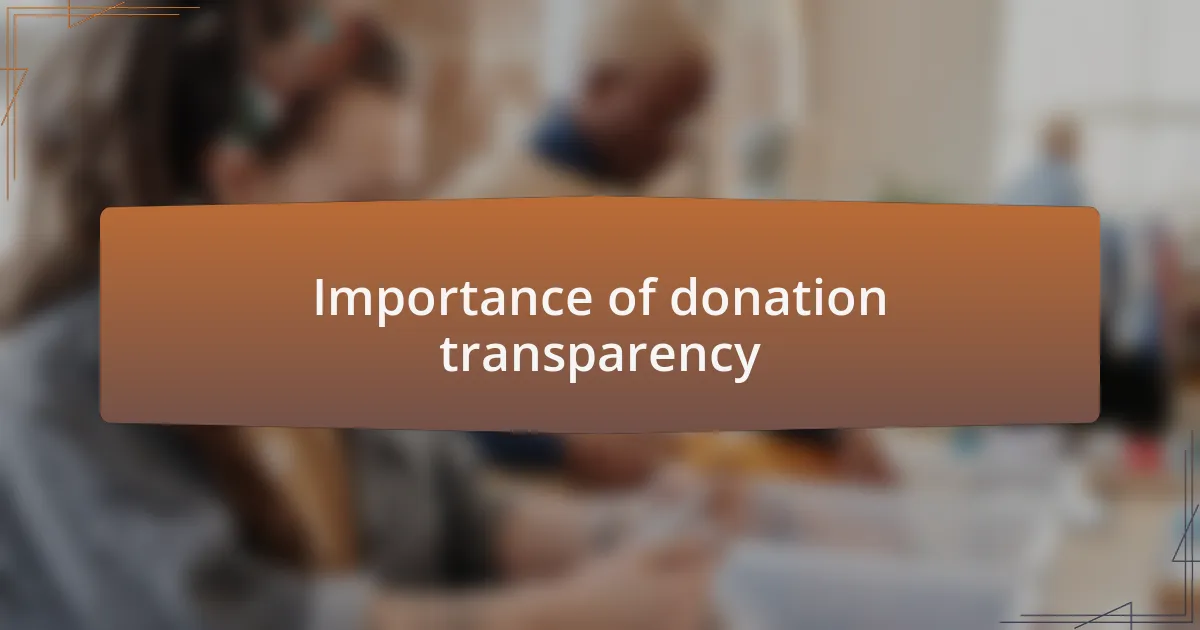 When I think about donation transparency, I can’t help but reflect on a time I supported a charity but later learned that a large portion of their funds went to administrative costs instead of the intended cause. That experience left me feeling disillusioned. It made me realize how crucial it is for organizations to provide clear insights into where every dollar goes; transparency can transform skepticism into trust.